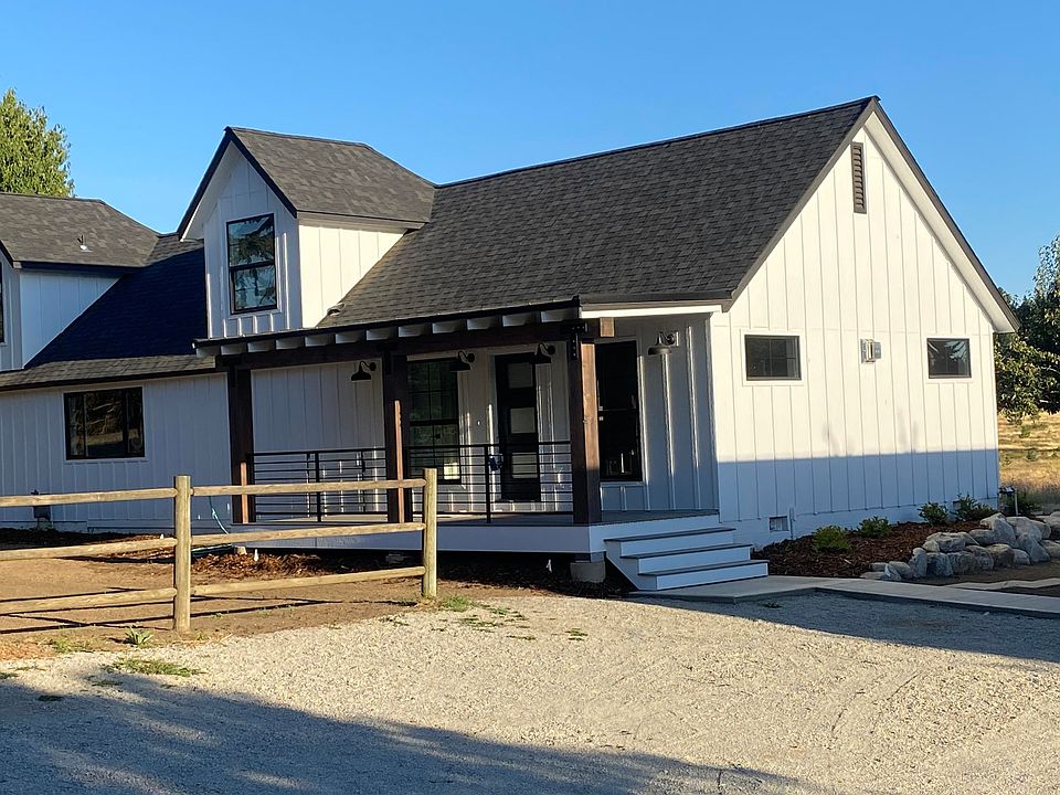 Remodeled modern farmhouse on 8 acres in Hayden. Plumbing, Mechanical, Electrical, Windows, Roof, siding and interior finishes are brand new. Main floor master bedroom with walk in closet and large deck off back on house. Vaulted living room is open to kitchen with White cabinets, farm sink and black and gold accents. Stainless appliances including micro drawer. 2 Beds and bah upstairs. Detached 24'x36' 2 car garage/shop with new roof and electrical and garage doors. Well has 3000 gallon storage tank. Basement is unfinished but heated.
