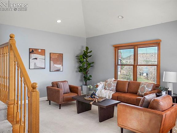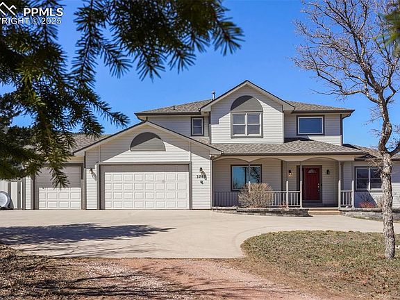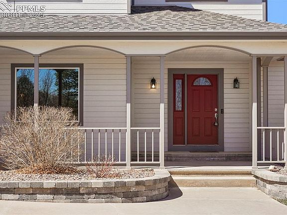 Located on nearly 1½ acres in highly desirable Red Rock Ranch, you’ll see Mountain VIEWS in every direction from this FANTASTIC D38 original owner two-story walkout with a 3-car attached garage AND a 2-car detached garage/workshop, complete with cabinets, epoxy flooring, heater, soundbar, auto retractable hose & electric cord from ceiling and ready-plumbed for an air compressor! Circular drive leads to a welcoming two story hardwood entry with a glorious transom window to let the light and views in, and is open to a formal living room on one side and formal dining room with arched entry on the other. Hardwood family room w/VIEWS and stacked stone gas fireplace, opens to the beautifully updated, eat-in, walkout kitchen with abundant soft-close cabinetry, large island with counter-bar seating, marbled granite countertops, copper veggie sink, updated pendant & recessed lighting, and custom barn door to laundry/mudroom with utility sink, large pantry & garage access. Back Trex deck w/accent lighting and plumbed for gas grill, leads to paver patio with built-in gas firepit. Upstairs you will find 2 bedrooms that share a full Jack & Jill bath, and an updated Primary suite with window seat/storage, his & hers walk-in closets, and gorgeous ¾ attached bath with new tiled heated flooring, walk-in shower with dual nozzles, granite countertops, dual vanity, soft close drawers, and MORE VIEWS! (it is even plumbed for a tub) The finished basement adds further functionality w/a bedroom/office suite & attached 3/4 bath, another bedroom, plus massive recreational space (plumbed for gas fireplace, and plumbed for a wet bar) that can accommodate a home gym, recreation area, or game room with walkout to an additional concrete patio. NEW CARPET THRU OUT! There is even an attached storage shed! This quiet neighborhood is in close proximity to multiple parks & trails, Monument & Palmer Lake, local restaurants, and easy access to Colorado Springs, Air Force Academy, Castle Rock, & Denver!