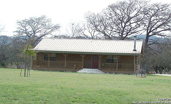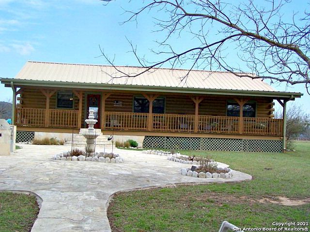 River front living at its finest in this 3BD/2BA log home. Very large lot. Plenty of natural light and neutral colors contrasting with gorgeous woodwork throughout the home. High ceilings, stone fp in living. Covered porches of 400SF each span the length of both front and back of home. Beautiful rock work abounds in the landscape with the focal point being a fountain surrounded by a patio, an outdoor kitchen and a fire pit for maximum entertaining space. Huge cypress trees frame the short walk to the 165' of Frio River frontage., Construction: [Log Home], Foundation: [Pillar/Post/Pier], Siding: [Log], Roof: [Metal], Garage: [None], Heat: [Central Electric, Heat Pump], Cooling: [Central Electric], Windows: [Aluminum], Window Treatments: [Some], Features: Ceiling Fan, Fireplace-Wood, Patio, Porch-Front, Porch-Back, Porch-Covered, Flooring: [Carpet, Hard Tile]