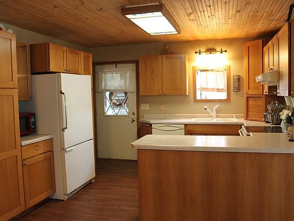 Open great room with knotty pine tongue and grove and kitchen and living room ceiling. Wood laminate floor in dining and kitchen. Shaker style oak kitchen with 2 pantries. Some new features: doors and trim, bathroom tub refinished, new vanity and floor, new drywall in main level bedrooms, freshly painted interior and new drain field in 2012. Easy access to 127 and close to schools.