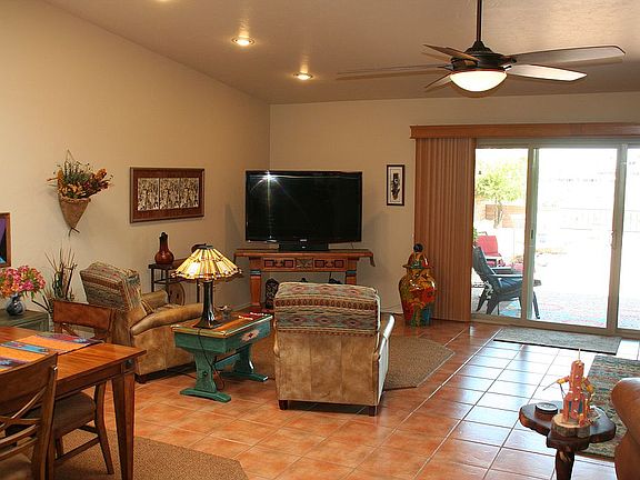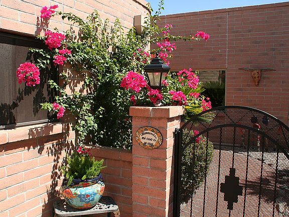 As welcoming inside as it is beautiful outside with panoramic views to the North and glorious mountain ranges to the East! This townhome comes furnished with a Southwest touch of class. A charming enclosed front courtyard & a back patio that has a special retractable sunshade awning. The kitchen cabinets have an antique wash that is complemented with a granite countertop. Beautiful mosaic tile backsplash and SS Appliances. Both bathrooms have been remodeled with dazzling vanities and tiled walk in showers. The master bedroom has an extra room for your favorite hobby, exercise equipment, or desk area. The den is inviting and will provide solitude with the pocket doors. The Stackable W/D is hidden in the closet next to the breakfast nook. Easy cleaning tile & laminate flooring. MUST SEE!