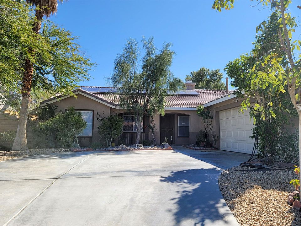 Lovely home in a unique neighborhood surrounded with panoramic mountain views in a very quiet and desirable area of North Palm Desert with NO HOA dues. This home features spacious 3 bedrooms 2 baths plus den and an office/gym or entertainment niche room. Freshly interior painted, ceramic tile, new carpet. Newly fenced back yard with a variety of mature fruit trees.