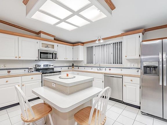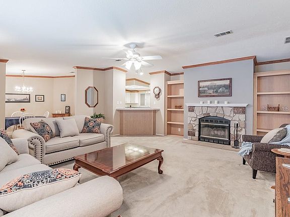 JUST WHAT YOU'VE BEEN WAITING FOR! Meticulously Maintained, Move in Ready, 2018 AC (heat pump), 2 car tandem garage, Workshop, Golf Cart garage, Enclosed Lanai, Back patio & 3 bedroom, 2 bath Jacobson home boasting Vaulted ceilings, Crown Molding, Stone Fireplace, Split Bedroom plan and OPEN Living Area! Concrete Curbing with Stone Landscaping Welcomes you with walkway to Enter thru storm door to Foyer. Spacious Living area invites you in with Wood Burning Fireplace as the Focal point, Triple window for natural lighting and Furnished Great room. Arched Opening to Dining Room with built in corner curios to display china & collectibles. FANTASTIC kitchen with Center island breakfast bar, New Stainless Steel Appliances, OPEN pass thru to Great Room, built in pantry. Light, Bright & Open with Large Utility room attached for overflow storage, Utility Sink, utility closet & built in desk for functional space! Large guest bedrooms have walk in closets & guest bath on same wing. 3rd bedroom set up as office with sliding door to enclosed Florida Room. BBQ or relax on OPEN back patio overlooking backyard landscape. Master suite, at front of home for privacy, walk in closet with organizer, spacious master bath with dual sinks, STUNNING new floor, new faucets, linen storage, soaking tub & separate shower with seat & grab bar. OWN your LAND in this 55+ Community with Low HOA! Enjoy Resident owned Clubhouse, pool, spa, billiards, shuffleboard, craft room, library, Private roads, Man Guard Gated entrance. CALL TODAY!