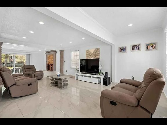 Step inside to an open floorplan with a large living room, dining area, and upgraded kitchen featuring custom cabinets, granite countertops, stainless steel appliances, and a walk-in pantry. Porcelain tile floors, a fireplace, and oversized windows make the home bright and inviting.