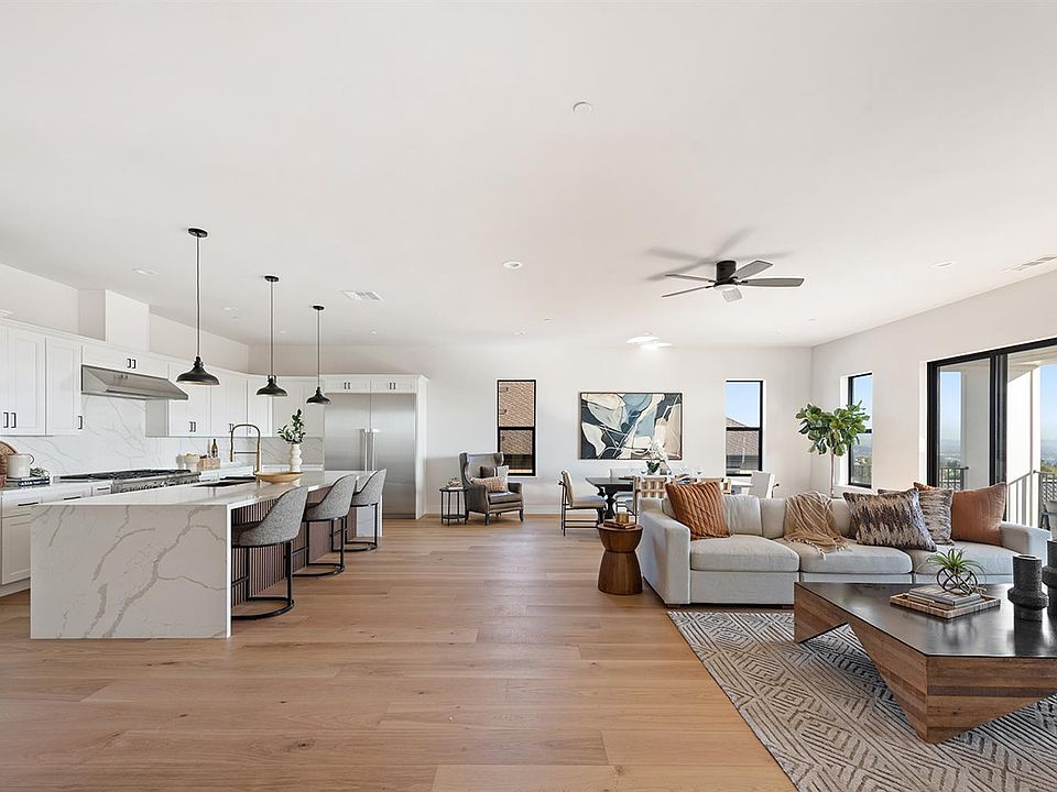 Set on a cul-de-sac in Santa Rosa's sought-after Fountaingrove neighborhood, this newly completed single-level residence offers exceptional modern design and energy efficiency. The open floor plan features 10-foot ceilings, engineered hardwood floors, and large windows that fill the home with natural light. The chef's kitchen boasts a $45,000 Thermador appliance suite, quartz countertops with full-height backsplash, and custom cabinetry perfect for everyday living or entertaining. Four bedrooms and four full baths include beautifully tiled spaces and refined finishes throughout. Built for comfort and sustainability, highlights include dual attic insulation, high-efficiency HVAC, owned solar with 5 kW battery, gas tankless water heater, and a finished, insulated garage. Situated on a quarter-acre lot adjoining Fountaingrove Open Space, the home offers southwest views from the covered patio and backyard. Experience the best of new Wine Country living with quality craftsmanship, timeless style, and effortless sophistication in one of Santa Rosa's premier enclaves.