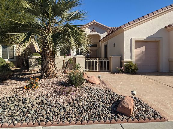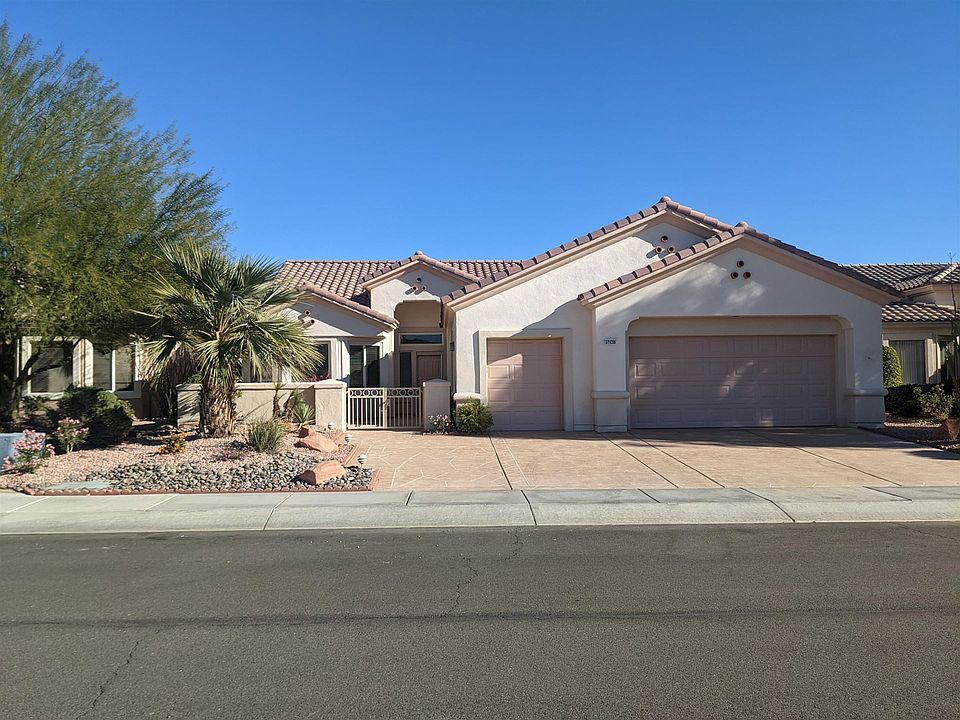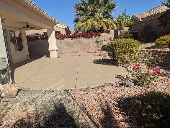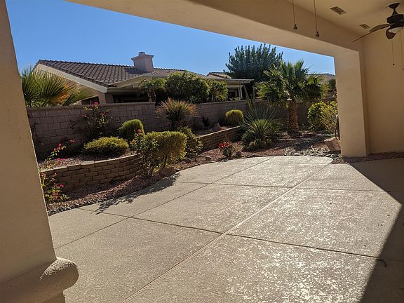 55+ Sun City Palm Desert. Very popular 2 bedroom, 2 bath St. Croix model with east facing extended patio with new custom textured overlay. Super nice curb appeal, overlay on driveway and gated courtyard. Weep screed installed. Inside, New windows throughout. brand new desert-toned paint throughout, and new carpet. The kitchen has a bay window for enjoying the view of the courtyard and to the peek-a-boo mountain view, a wonderful center island, Corian counters, pull-out in upgraded cabinets, Master has new carpet, bath has soaking tub and walk-in shower, upgraded cabinets. Guest bath has upgraded cabinets and cultured marble counters. Large Den/Hobby room is a great flex space for office/guest space or art room. Garage has epoxy coating, shelving and cabinets. Patio is extended and has raised flower beds and firepit. Very relaxing space great for entertaining for the holidays. Easy maintenance landscaping.