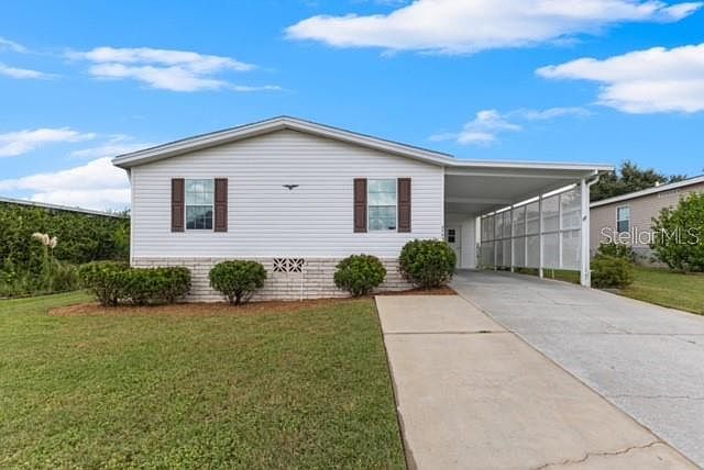 GRAND HORIZONS: Beautiful 55+ gated community: Jacobson 3-bedroom, 2-bath desirable split-plan home.. This well-maintained home features a kitchen with a dinette, a formal dining area, and a cozy decorative fireplace. For added convenience, there is a laundry closet off the kitchen. The spacious master suite includes walk in closet and a walk-in shower and dual sinks, while a lovely Florida room at the back provides a sense of privacy. Recent updates include a new roof in 2018, HVAC in 2016, and a water heater in 2021. There is a storage shed, carport and vinyl siding adding great curb appeal. Grand Horizons is a vibrant community offering fantastic amenities such as a pool/hot tub, clubhouse with billiards, craft room and library. There are shuffleboard courts, and an social calendar. Plus, NO LOT RENT! The location is ideal, with nearby hospital, grocery store, a bowling alley, movie theater, fitness facility, and medical facilities, making it perfect for those seeking comfort, convenience, and an active lifestyle.