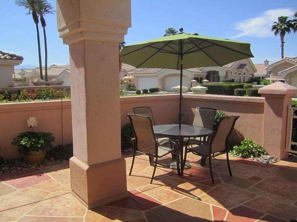 Darling Villa with the best location and views offered. South facing patio with views of the green belt. 1 bedroom 1 bath, sits on a park-like green area maintained by the HOA. Villas are very sought after and rarely come on the market. This one won't last Enjoy the desert lifestyle and amenities the community has to offer like pools/spas, golf, tennis, fitness centers, restaurants and many chartered clubs and activities. Located very close to Mountain View clubhouse. This home is bright and open with tasteful appointed décor and furnishings many of which are newer. Welcoming courtyard with colored stamped concrete as well as on driveway and back patio overlooking the lush greenbelt. Eat-in updated kitchen with stainless steel appliances, slider access to courtyard and overlooking the dining and living room areas. Plantations shutters throughout, plenty of windows to allow the natural light in and tile flooring in main traffic areas. Bedroom suite with bay window and sliding door that leads to the patio. Many upgrades like: Thermofoil cabinet surfaces in kitchen, pullouts, water heater in 2017 and refurbished AC in 2019, new weep screed in front patio. Individual laundry room. Attached garage can accommodate one car +golf cart. It will not last Furniture Available outside of Escrow.