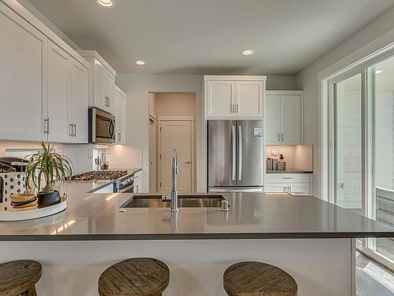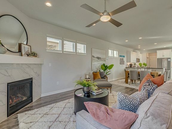 Fantastic Conifer cottage home by award winning quality builder Pahlisch Homes. You will love the open concept kitchen/dining/great room. Cozy corner gas fireplace and sliding glass door leading out to side yard with covered patio. Quality finishes include: stylish white wood cabinets, Quartz kitchen & bathroom counters, large kitchen island, stainless steel appliances, luxury vinyl plank flooring throughout main living/kitchen/dining/bathrooms, double wall construction for added insulation, gutters and fenced with gates at each end of side yard. Photos of similar floorplan, specs vary. Front yard landscaping, and AC pre wire included. Homeowners and residents here will have access to a full spectrum of private recreational amenities including swimming pools, parks, green spaces, and paved paths by Summer 2023.