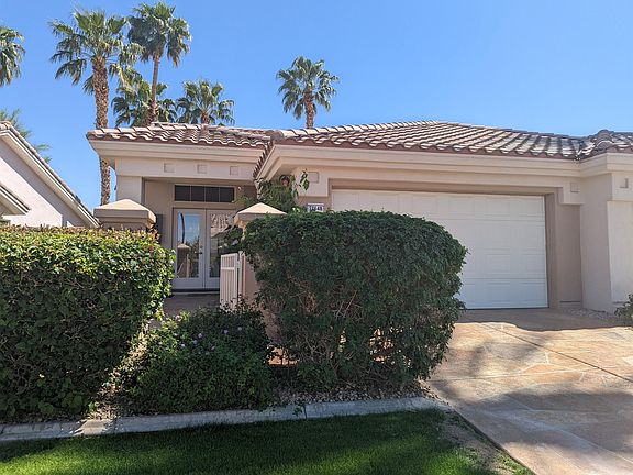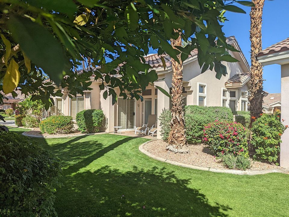 Professional photos on 4/9...55+ Del Webb Sun City Palm Desert. Very rare VACATION VILLA RETREAT model on a gorgeous lush southeast facing greenbelt. Located within walking distance to the main Mountain View clubhouse. Large gated private entry courtyard. Custom concrete overlay on driveway, courtyard and patio. Inside, skylight in entry, open concept, bright and cheery living room and dining room with views to the patio. Plantation shutters and transom windows throughout. Kitchen has French door to the private entry courtyard and Corian counters. Master suite is spacious with sliding door to patio, large bay window and window seat, carpet, two closets. Master bath has single vanity. Laundry room is a separate room and has glass block accents for extra light. Washer and dryer included. Patio is covered with sitting area and views beautiful down the greenbelt. Garage has room for one car and a golf cart and has epoxy coating. Turn-key furnishings and golf cart negotiable outside of escrow.
