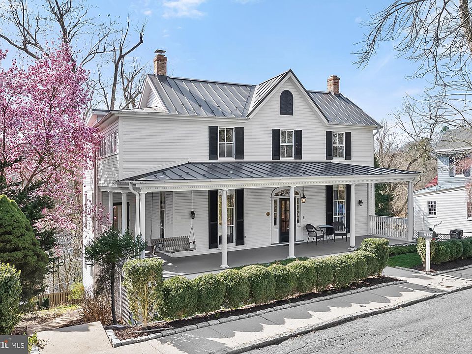 Prepare to fall in love with this charming four bedroom, three full and one half bathroom home in the heart of Old Ellicott City. Built in 1872, this extraordinary home seamlessly blends the original features with luxurious modern amenities. As you arrive, the covered wrap-around front porch greets you and is the perfect spot for enjoying a morning cup of coffee on the swing or watching passerby. Step inside to the foyer that showcases the refinished original oak flooring that continues through the main level. Highlighting an abundance of natural light throughout with floor to ceiling windows, a serene color palette, tall nine foot ceilings, and ornate millwork including dentil crown molding, chair railing, and wainscotting. The front living room features a decorative fireplace and a vintage built-in closet for storage. Off the foyer, double French doors lead to the dining room with a custom wood mantel, and the original pocket doors connect to the family room, offering flexibility while hosting gatherings. The family room also has glass double doors opening onto the wraparound porch, seamlessly blending indoor and outdoor living. Create your chef-inspired meals in the eat-in kitchen with stainless steel appliances, granite counters, recessed lighting, engineered maple wood floors, a built-in corner curio cabinet and space for a breakfast table. An oversized picture window in the kitchen overlooks Old Ellicott City with unparalleled views. The main level also hosts a laundry room, a walk-in pantry and half bath with marble flooring. Upstairs, a stained glass light illuminates the regal staircase and refinished original heart pine floors adorn the bedrooms. The primary bedroom is a light-filled retreat and the primary bathroom has a walk-in shower. The second bedroom includes an almost soundproof sitting room with a vaulted ceiling - perfect for a cozy nook or office. The third bedroom boasts a decorative fireplace and stained glass hanging light fixture. Down the hall, the second full bathroom has a jetted soaking tub, and around the corner the walk-in dressing room closet offers tons of storage. Downstairs, the walk-out lower level is ideal for a separate living suite with the fourth bedroom and adjacent full bathroom. The bonus room is a versatile area with a walk-in storage closet and the recreation room also is another space for everyone to spread out. A covered balcony provides the perfect spot to unwind and the exceptional grounds are complete with stone retaining walls, landscaping with flowering trees, a stone patio, and tons of yard space backing to trees. Enjoy living in Old Ellicott City, overlooking Main Street, the Patapsco River and passing trains. Just down the street with pedestrian-friendly access to Main Street for drinks, dining, shopping, exploring and events such as outdoor movie nights and festivals. This coveted home is even included on multiple murals on Main Street and is featured in some of the museums. Located around the corner from the trolley trail for enjoying the serene nature around you with the nearby Roger Carter Community Center. Guaranteed easy parking with a two-car detached garage with electric, and a driveway - also plenty of street parking. New dishwasher in 2024, air conditioning unit in 2022, radiator covers and custom window treatments 2021. Energy-efficient zoned heating and cooling systems (Central AC) with programmable smart thermostats. Hot water radiators service the main and upper levels. Newer metal roof, gutters and downspouts installed in 2016, along with new custom milled hardwood cypress siding. With its blend of historic charm and modern updates, this home offers a truly unique opportunity to live in Old Ellicott City. Due to a Historic Preservation Tax Credit that was received several years ago, 3 years of tax credits (towards the county portion of the property tax bill) remain!