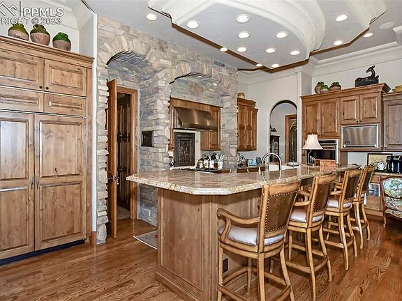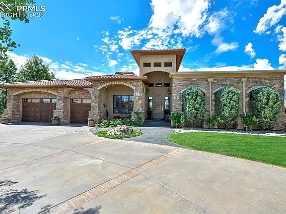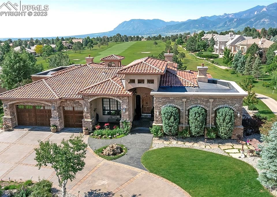 Gorgeous custom home with incredible views of Pikes Peak, Cheyenne Mountain & the Front Range The main level features hardwood floors throughout, large entryway opening to the living room with gas fireplace and lots of natural light, adjacent formal dining room, wet bar, and multiple walkouts to the main level deck featuring outdoor gas fireplace, built-in grill and terrific views. The gourmet kitchen features Wolf & Sub-Zero appliances, granite countertops, hardwood cabinets, eat-in bar and attached breakfast nook with informal family room with gas stone fireplace and additional walkout to deck. The main level offers the option of one level living. The Master/Primary bedroom featuring 5 piece bath with jetted tub, Pikes Peak views, expansive walk-in closet and walkout to deck. There is a second bedroom that can function as a bedroom or office, also with walk-in closet, attached bath and walkout to deck. The lower level includes 3 large guest suites all with in suite bathrooms, large walk-in closets, and walkouts to patio. There is a lower level family room with game areas, wet bar, media space, gas fireplace, & bonus rooms for hobbies, plus storage.