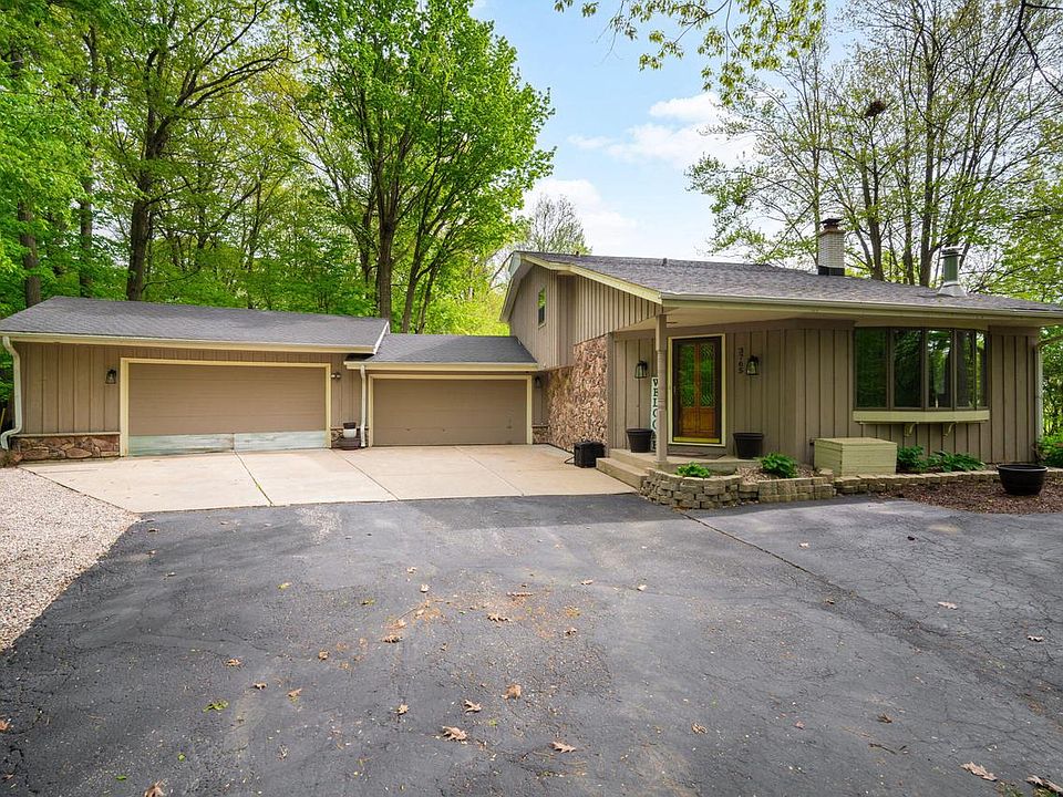Enchanting 3 bed, 1.5 bath tri-level retreat on a private 1.61-acre wooded lot with cedar/vinyl siding and attached 4-car garage. Soaring vaulted living room with wood plank ceiling opens to a lower-level kitchen and dinette, flowing to the outdoors via patio door. Warm family room with a corner stone fireplace adjoins the kitchen. Three spacious upper-level bedrooms share a full bath. Ample lower-level storage. Relax on the deck under a charming gazebo, overlooking a serene mature tree lot. A perfect blend of style and tranquility!