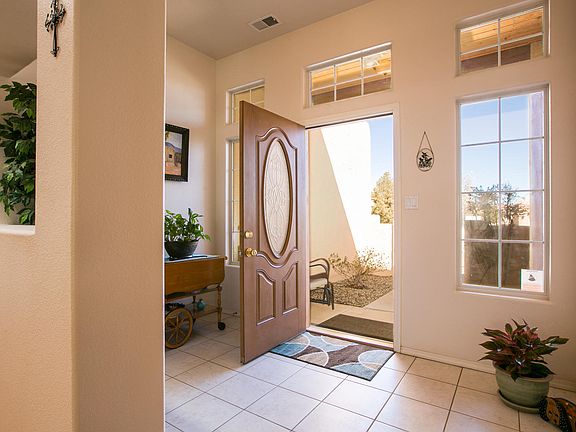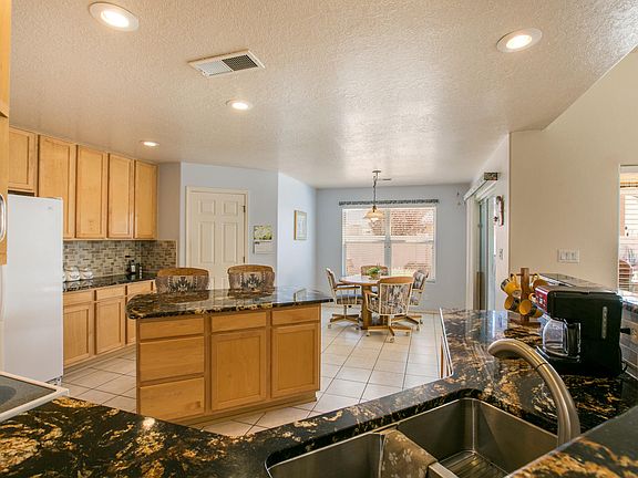 Rush to see this immaculate, 3 bedroom home in desirable High Resort area of Rio Rancho. All on one level, the home features an open floor plan with split owners suite and 2 other bedrooms. Cook's kitchen with level 5 granite countertops, island and gorgeous maple cabinets... walk in pantry and breakfast nook too. Huge formal dining room provides ample space for large dining table and china closet or buffet. Spacious great room with cozy fireplace. Private owners suite with luxe en suite bath with separate garden tub and separate shower. Nearly 1/4 acre lot with possible backyard access and covered patio with wood tongue & groove ceiling is perfect for outdoor entertaining. Tandem 3 car garage provides all the space you need for the cars & toys. Refrigerated air too. Available to view 3/29