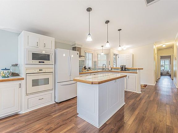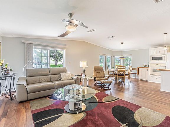 COUNTRY LIVING in the City!! Welcome HOME to this elegant 2003 Jacobsen home in the 55+ GATED community of Grand Horizons, where you OWN your LAND! OVER $40,000 in upgraded features and Offering over 1,500 square feet of renovated living space, this UNIQUE, remodeled home has a newly painted interior, expanded workshop, custom upgrades and GARDEN in the backyard!! Stunning PAVER driveway, walkway and extended golf cart parking welcomes you to enter thru glass storm door into a bright and open floor plan with soaring vaulted ceilings and crown molding that creates an airy, inviting atmosphere. The spacious, CUSTOM kitchen is truly the heart of the home, featuring a center island with handmade wood trim & pendant lights, tile counters, smooth-top range, wall oven, stainless vent hood (2022), microwave, side-by-side refrigerator, tile backsplash, and abundance of cabinets. A charming bay window in the dining area adds warmth and natural light, making this space perfect for family gatherings and entertaining with views of the front lawn. French doors lead to a versatile den/office, offering endless possibilities for a home office, study, guest bedroom or craft/quilting/sewing/hobby room. The private owners suite is generously sized, complete with a large walk-in closet and French door entry into the luxurious bath ensuite featuring dual sinks, garden tub with a glass block window, separate walk-in shower plus built-in glass linen cabinet. A comfortable guest bedroom is located across from the full guest bath and a convenient inside laundry room adds to the home’s functionality. Two front entrances into this home for versatility, with a ramp leading to the front porch with sliding glass doors opening into the Light, Bright GREAT ROOM with neutral painted interior. Outdoor living is a delight here! Relax on your covered front porch while enjoying the beautifully landscaped yard and neighborly visits, or retreat to your greenhouse/raised bed Garden area in your PRIVATE BACKYARD, surrounded by mature trees for a serene, park-like setting. A huge attached storage shed with a garage door provides ample space for holiday décor, tools, workshop, lawn equipment and golf cart. Recent updates include a Rubber ROOF (2020) for peace of mind, Double pane windows (2022), Custom kitchen, Plantation shutters, Tempstar AC installed by Bahrs and Luxury Vinyl floors (2019)! The community itself is brimming with RESIDENT OWNED amenities... GATED entrance, Private streets, Sparkling, heated swimming pool, hot tub, craft room, library with games, puzzles, books and movies, shuffleboard courts, bocce, horseshoes and a 6,000 sq. ft. community center with year-round activities, pot-luck dinners, onsite entertainment and travel excursions. Located just north of Tampa in Zephyrhills within one mile of shopping, restaurants, medical facilities, bowling, movie theater, YMCA, wellness center and major highways for easy access to Wesley Chapel, Lakeland, Ocala, Orlando theme parks, Airports or the Beaches! This home truly offers the best of both worlds: a peaceful retreat with the option to enjoy an active, vibrant lifestyle where you can grow your own food! Don’t miss your chance to make this Grand Horizons piece of paradise your new home... CALL TODAY!