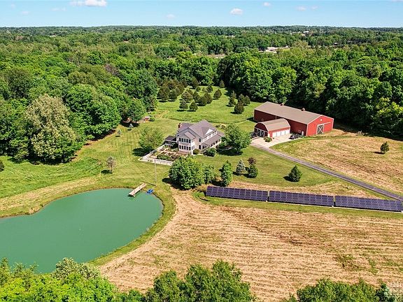 Picturesque, private 58 acre property that could be totally off grid if desired. 22KW grid tied - off grid SMA Sunny Boy& Island solar system( has 24 hr battery backup system. 4 bdrm, 3.5 bath home w/full finished basement & panoramic view of woods, pond & nature from abundance of windows. Open entry w/wood floors, formal dining rm w/transom windows, family room w/gas or WB fireplace & 19 ft ceiling. Main bedroom has extra room for nursery, study, office. Kitchen island, breakfast nook & abundance of cabinets. Finished basement has large recreation room & additional storage. Dual propane furnaces supplied by (2) 1000 gallon tanks . Hard piped to 20 KW Kohler propane generator. Well fills 2500 and 5000 gallon tanks that are also connected to 2 halves of barn & has numerous purification systems in place. 2 a/c units are only 4 years old, shooting range located on property, 54x114 recreation barn features regulation tennis court, ideal for soccer, golf, basketball +more. Additional 30x45 barn w/ lift for the car buff and tons of storage. Ideal for home school academy, sports, barn, fishing, gardening, home economics, shop etc!! Vegetable and herb garden beds galore, blueberry bushes for gallons of blueberries, blackberries, raspberries and espaliered apples, cherry bushes! The utmost in privacy, peace and quiet surroundings!