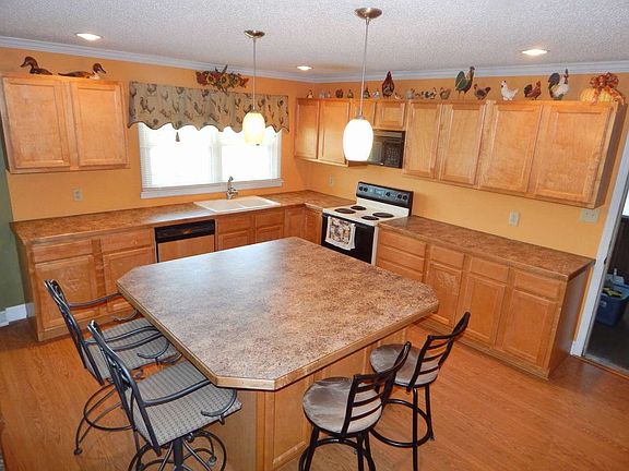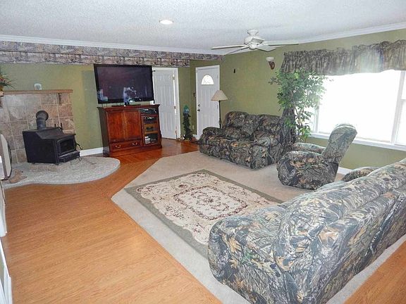 Gorgeous ranch plan on 1.16 acres with NO restrictions! Large, open living areas. Living rm has a free standing Buck wood stove w/tile surround, wall LP heater, & recessed dimming lights. Open kitchen has a 5x5 center island for dining & Maple cabinets w/lots of storage. Crown molding throughout. Huge 19' laundry/utility rm. Master suite has French doors leading to the deck, hardwood flrs, & a 5x11 WIC. Master bath has a custom tile walk-in shower w/seat. Wired workshop/storage. Lots of fruit trees too!