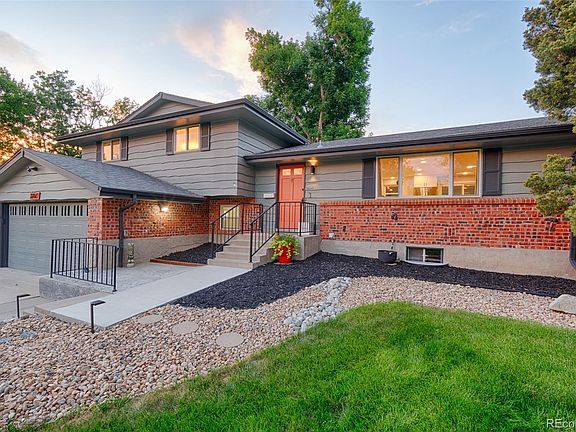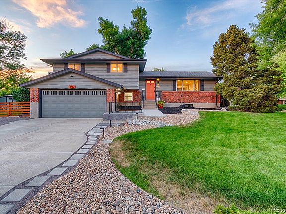Discover this beautifully updated 1966 tri-level home in Centennial's Kings Point neighborhood, situated on a spacious quarter-acre corner lot. This home features an open concept design, ideal for modern living and entertaining. The large, updated kitchen with high-end finishes and modern appliances is perfect for culinary enthusiasts. The primary suite offers a spacious retreat with an updated ensuite bathroom with a large dual vanity. Updated bathrooms, refinished original hardwood flooring, and new high-end windows provide excellent insulation and natural light throughout. The basement includes a European style egress window, adding both safety and style. This turn-key home retains its original charm with an unpainted clinker brick exterior and wavy edge cedar siding. Located near Southglenn, DTC, and Trader Joe's, you'll have convenient access to shopping, dining, and entertainment. Access to the Highline Canal, a 72 mile long trail, is just around the corner. Enjoy the covered patio for outdoor dining and relaxation, regardless of the weather. A separate fenced yard area is perfect for pets adding to the large scenic yard which offers ample space for gardening and outdoor activities. Experience the blend of vintage charm and modern comfort in this Kings Point home—schedule your private tour today. Check out the virtual tour https://3767.TheRetroRealtor.com/