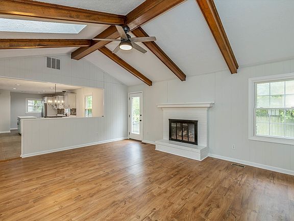 NEW ROOF installed this spring on this classic & charming brick ranch with OPEN floor plan, fresh paint & vinyl plank throughout! Family room features vaulted ceiling & skylights that add to the bright airiness. Kitchen includes gas cook top, newer SS fridge, and center island. Primary Bedroom is incredibly SPACIOUS with double closets and an ensuite bath with double sink vanity. Privacy fence encloses a lovely & lush back yard to enjoy on the patio. NEW WATER HEATER installed this spring also. This home was originally a 3 bedroom and could easily be converted back.