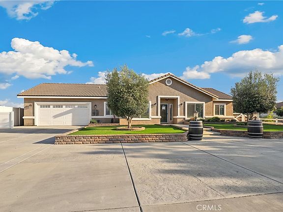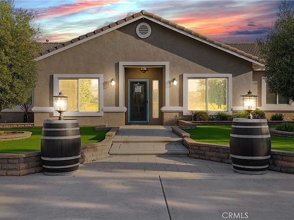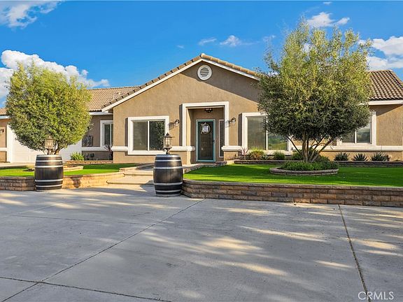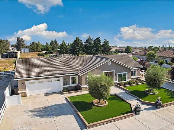 Beautiful ranch style home on horse property with mountain views, No HOA and a Low tax rate! This home sits on a huge, flat, sprawling fenced, almost 1 Acre Lot (37,987 SF). HORSE PROPERTY with corrals, in/out shelter and chicken coop plus tons of concrete parking with gated RV access/parking. This single story home is move-in ready and features 4 bedrooms/2 bathrooms, 2,200 SF of living space with custom leaded glass entry door plus a Den or 5th Bedroom option. The spacious floor plan offers high ceilings, recessed lights, custom baseboards, laminate flooring and a whole house fan. The Formal Dining Room sits off of the entry and features a chandelier. The Living Room has custom built-in cabinets, a ceiling fan, and views of the backyard. A gorgeous high Archway opens from the Living Room to the Breakfast Nook and Kitchen with custom lights, granite counters offering bar seating, stainless steel appliances, dark cabinets with pullouts and a walk-in pantry. The large Primary Suite features a barn door entryway and a spa-like ensuite with Roman tub, a separate shower, dual sink vanity, and huge walk-in closet with shelving. There are 4 large Secondary bedrooms all on the opposite end of the home as well as a full-size hall Bathroom with tile floors and wood accent feature wall, and a Den/Office at the end of the Hall. The Indoor Laundry Room sits off of the Kitchen and has lots of storage space. There is an attached 2-car garage with cabinets and a multipurpose room 11ft X 9ft (approximately) for storage, gym, workshop, or crafts! Enjoy the large backyard with Alumawood patio cover featuring a ceiling fan and full length pergola that extends the full length of the home. There is also a built-in BBQ with griddle, concrete area, lush green grass, a horse corral and pen, a shed, an orchard with 15 citrus trees including orange, lemon, avocado, peach trees, and plenty of room for a future pool, ADU, toys, shop, etc! Close to schools, shopping, and easy access to 10 and 60 Fwy. THIS IS A MUST SEE HOME!!!