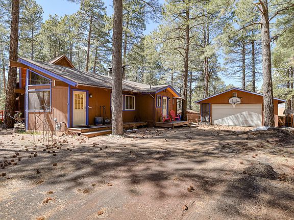 Cozy cabin nestled in the pines of Kachina Village. No HOA! 2 car garage and plenty of space to relax and enjoy the tranquil outdoors. An open kitchen and comfortable living room add to the charm of this mountain home. The sun room is a fantastic feature that can be enjoyed year round. Great opportunity for a year long resident or a home away from home.