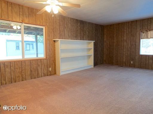 Newer carpet and vinyl floors, a spacious floor plan, and nice built-ins make this double wide mobile a perfect place to call home! Two bedrooms and two full bathrooms. Nice size master suite on the side of the home and a guest suite with direct access to the guest bathroom is at one end. Both bedrooms feature mirrored closet doors and lighted closet interiors. Master bath has tub and a corner shower while the guest bath is a tub/shower combo. The large kitchen includes a refrigerator, range/oven, new dishwasher, ample cabinets, breakfast bar and dining area with built-in mirrored and lighted hutch. The living room is open and has a built in shelving unit. The large laundry area with included washer and dryer has a built-in desk and is large enough that it can be used as a mud room. Heat is provided by electric furnace and there are newer windows throughout. A covered deck, metal roof and storage unit are bonuses on this home. Rent includes park space rent, water and sewer. Move-in rea (RLNE1884113)
