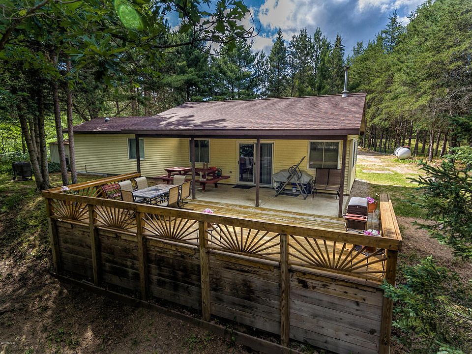 3 bed 2 bath move-in ready home on Muskegon river. Large 200'x400' lot with 200 ft of gorgeous river frontage. Picture yourself kayaking right outside your backdoor. Store your toys in the huge 30x56 pole barn with cement floor, drain and additional 16x30 lean-to & 2 sheds for storage. New roof in 2017. Floor to ceiling tiled walk-in showers in both bathrooms. Well appointed master bedroom with large master bath with double sink, completely tiled walk-in shower and large vanity space. This homefeatures oak trim, newer insulated vinyl windows, solid surface floors and tiled kitchen floors. Big deck off the living room looks down to beautiful stands of cedar trees heading down to the river. Prop incl approx 7.5 acres across street & vacant lot next door to the south. Move in ready!