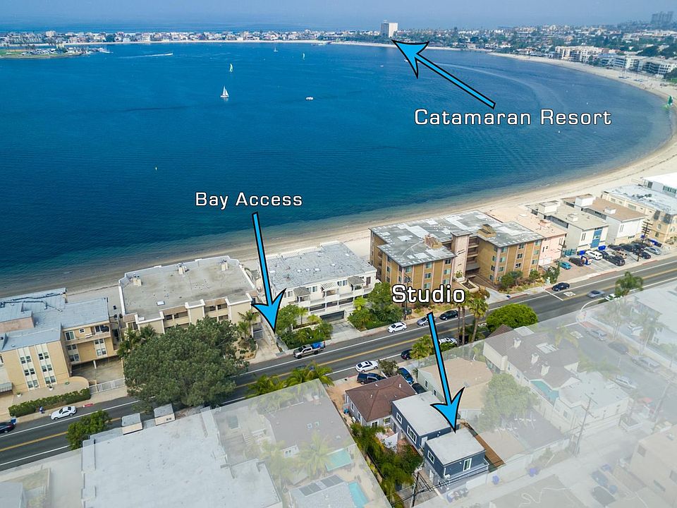 Beautiful Air-Conditioned studio apartment for rent on Riviera Drive, steps to Sail Bay (walk across Riviera direct to bay access). Top floor (great breeze), no shared walls, only neighbor below. Quartz counters. Full Kitchen (no dishwasher). 2nd story, 1 flight stairs up. 400sf, with 100sf balcony.