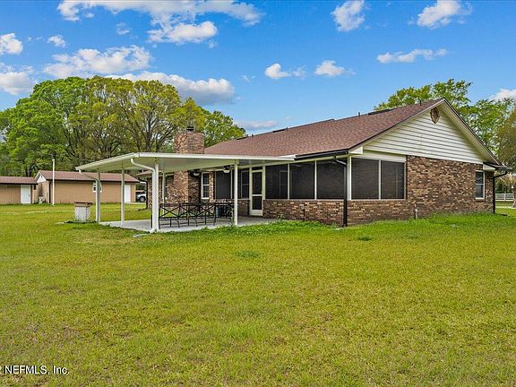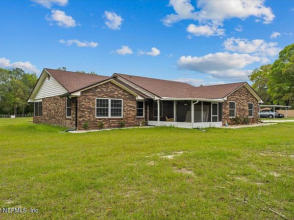 If you are dreaming of a serene and picturesque (4 acres) mini farm on the outskirts of city life, then this is it! As you approach the property, you immediately notice that it is entirely fenced in; the main gate requires a passcode to enter adding to its safety benefits and security. This single-family home's exterior is entirely made of brick and the interior floors are completely covered with porcelain (wood) tile throughout. Enjoy creating meals in this spacious kitchen with all stainless-steel appliances, granite counter tops, and complete with a farmhouse sink. Open plan from kitchen to breakfast nook and family room, which is equipped with a beautiful, full-functioning, wood burning fireplace. The master bathroom is absolutely stunning; furnished with a gorgeous freestanding tub, deep walk-in shower, separate toilet room, and includes his and her vanity sinks. The master bedroom is split from the other two bedrooms. Enjoy the view from the front screened in patio or take advantage of the back screened in patio that overlooks the pasture, a half-acre stocked pond with fountain and fishing gazebo. The barn is ready to handle all your livestock; rigged with tack room, workshop, loft, stalls, half bath, and plenty of space for tools and equipment. In addition to ALL of that, there is a fully fenced in dog coup that can covert to chicken pen, separate unattached two car garage, a pump house (both well and filtered water systems), and an outdoor firepit. This house has been totally renovated: new roof, new windows, new doors and locks, security system, and the interior has been freshly remodeled and brought right up to date. Do not miss your chance to own a farm of this caliber and at this price: 10 minutes from the Jacksonville Equestrian Center, 30 minutes from downtown Jacksonville, 45 minutes from the beach, 60 minutes from historical St. Augustine.
