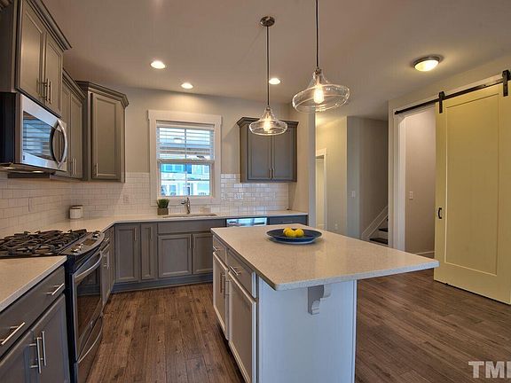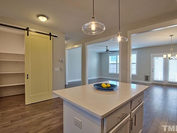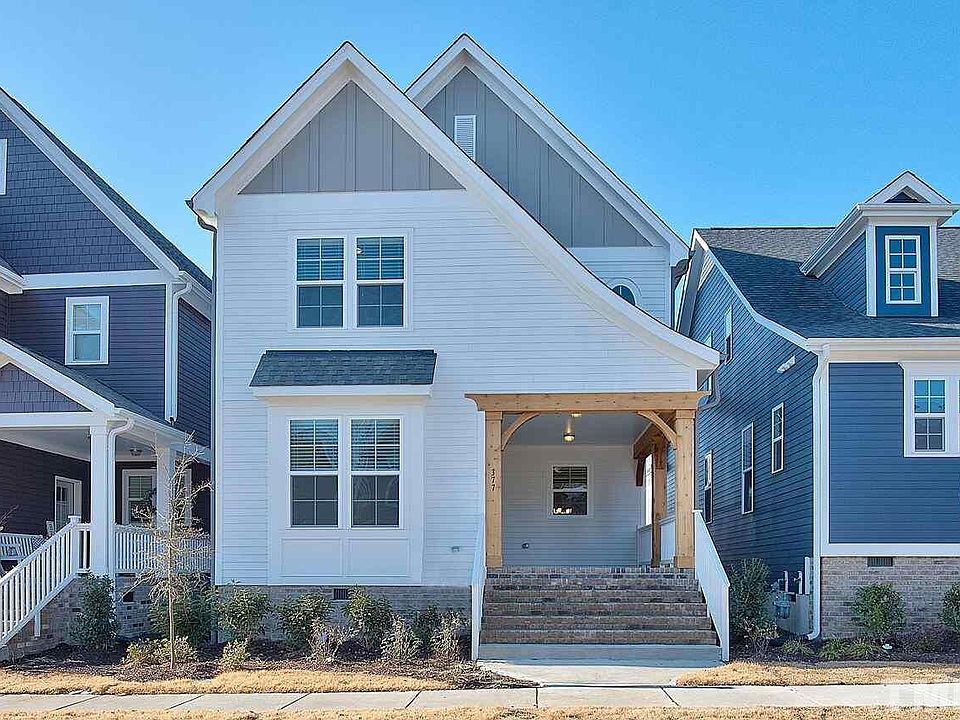 The largest new-home green community in the triangle reintroduces this chic, grey and white interior color palette. The kitchen is equipped with quartz countertops, graphite cabinets, white subway tile and a white accent island, perfect for entertaining. Sun drenched master bedroom and bath with a glass walking shower and garden tub. Covered front and back porch great for entertaining or just relaxing and enjoying the outdoors.