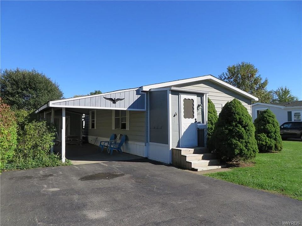 Attractive well maintained double wide features large living room opening to dining area and efficient kitchen. Small enclosed "foyer" at front entry. There is tiled flooring at doorway and wall to wall carpeting in living room and both bedrooms. Kitchen has laminate floors, oak cabinets, pantry, built-in china cabinet, all appliances stay (even washer and dryer). Two large bedrooms w/huge closets. Master also has an additional 11 X 5 walk in closet. Full bath is in excellent condition. 6 panel doors, partial (one side) tear off roof in 2016, vinyl fascia, new pressure treated wood front steps. Deep carport has excellent concrete surface and large storage shed. Window air conditioner is included. Interior photos coming soon. Showings begin on Thursday October 11th.