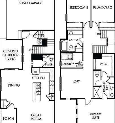 Open-concept floorplan with ember white cabinets, earth tone granite countertops, and dark EVP flooring and beige carpet in our Warm Transitional collection. Beautiful added features: gas range and second sink in secondary bath.