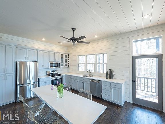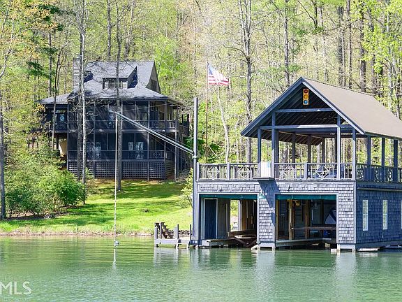 This completely renovated home is move-in ready! Kitchen & family room open to lakeside screened porch. Generous main floor owner's suite features private porch with lake views & full bath with separate vanities, water closet, tiled shower with seamless glass & walk-in closet. Guest bedroom with full bath also on main. Second floor features private guest suite with vaulted ceiling & study. Terrace level offers rec room with built-in bunks, full bath, laundry closet & wall of sliding glass doors that open to lakeside screened porch. 2-stall boathouse rests in protected swimming cove with long lake & mountain views. This private 1.75 ac. lot is less than 1 mile from Waterfall Club and offers easy access to downtown Clayton. Approved expansion plans on file.