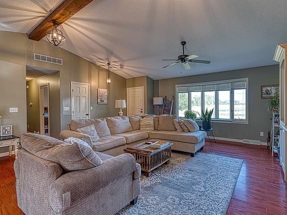 Step inside and be welcomed by the impressive Great Room, featuring soaring cathedral ceilings, a cozy fireplace, and durable laminate flooring—an ideal space for both relaxing evenings and entertaining. The eat-in kitchen is equipped with stainless steel appliances and offers convenient access to the back deck through sliding patio doors. Enjoy outdoor living on the 18x12 Trex deck, that has been expanded, perfect for kids, pets, or gatherings with friends. Each bedroom includes crown molding, generously sized closets, and built-in organizers. The hall bath has been updated to include a new vanity, tiled shower, larger tub and a charming tile floor. The primary suite offers an oversized 8x5 walk-in closet and a well-designed bath, where the vanity area is smartly separated from the shower and commode. Additional highlights include a 20x16 lofted outbuilding with insulation, shelving, and hanging storage—ideal for tools, hobbies, or extra storage needs. A water spigot just outside the doors adds convenience for outdoor projects. Set in a beautiful and peaceful location, this property combines the best of country charm with modern comfort. Per seller, some recent updates include A/C replaced 2024, Furnace replaced 2021, new water softener system, newer stainless appliances.