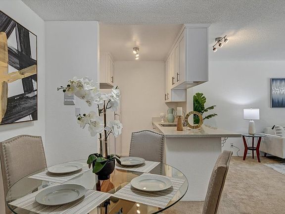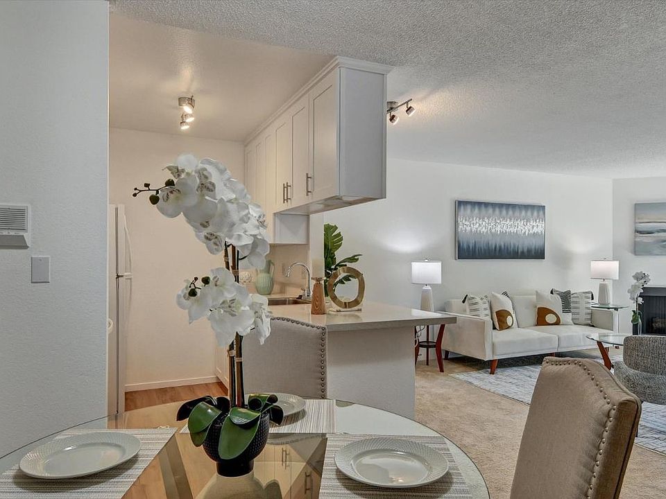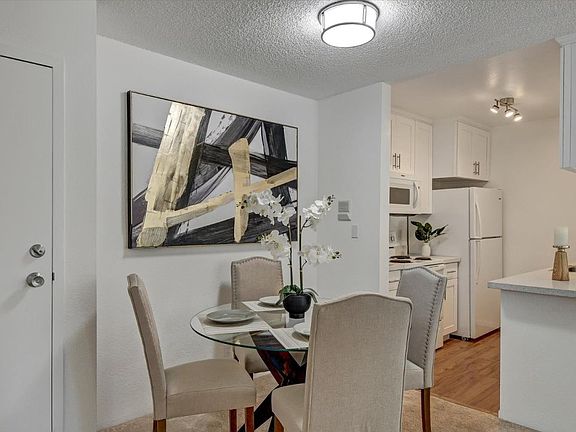 Bright & sunny 1 bedroom unit recently painted. Corner location with no one on one side of you! Shows extremely well with updated kitchen & vanity area. A modern barn door leads you in to the spacios bedroom with 2 mirrored closet doors. Conveniently located near the 3 story Clubhouse which features an indoor/outdoor pool, gym, sauna, billiards room, & more. Nicely remodeled kitchen with shaker cabinets, quartz counters, & built-in microwave. Pass through the sliding barn door to the bedroom with 2 closets both with mirrored doors. Enjoy your morning coffee out on your spacious private deck overlooking the quiet greenbelt below. Have home-cooked meals in the cozy dining area or on top the breakfast bar. The complex features a dog run, nice walkways, gazebos, a duck pond, and tall majestic eucalyptus trees all in a sprawling 23 acres.