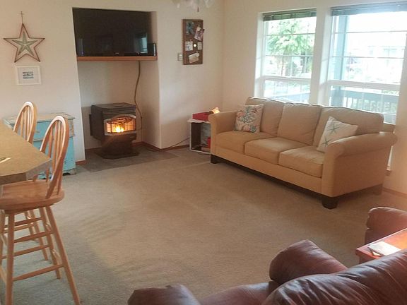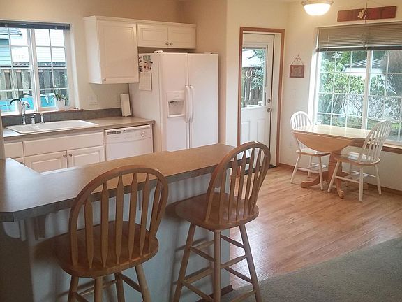 Open floor plan; Living, Dining & Kitchen. 3 Bed Rooms, 2 Bath Rooms. Main floor living w/Ground Floor Bedroom. Abundant storage. Attractive aggregate concrete patio w/lawn area side yard. Room to park Boat/RV next to single car garage. Small sheds included. Beautiful landscape alongside covered porch. Great for entertaining family and guests. House on an oversized lot in a very quiet neighborhood. Five minute walk to 7 miles of beach. Beautiful Mountain views with the touch of sound from Ocean waves.