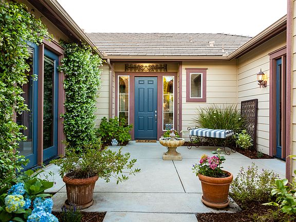 Enjoy quintessential neighborhood living at it's finest with the Homes at Ballard Canyon. A courtyard entry leads you through to the main entrance surrounded by mature star jasmine and hydrangeas. Enter through to the spacious formal living & dining room and off to the right is the family room with custom built in shelving for the TV and a fireplace. The living room connects to the kitchen, breakfast nook, and laundry room. This home offers three bedrooms, plus an office/den, or what could be a fourth bedroom, with a custom sliding barn door entry and custom built in shelving. The 10' ceilings create an open feel throughout the entire home. The floorplan offers traditional living spaces while still allowing for connection when entertaining. French doors