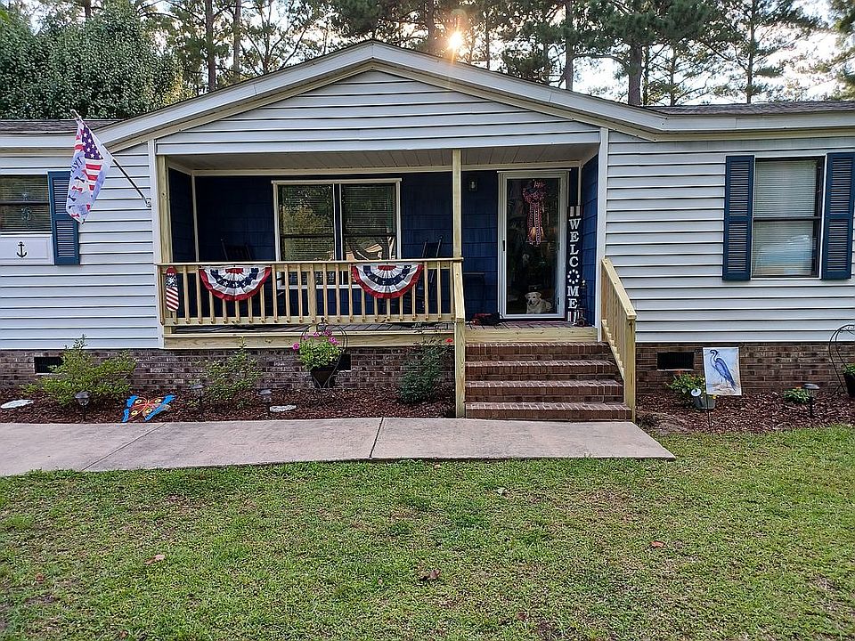 Are you ready for beach life in a friendly neighborhood? if so come check out our home located in Ocean Forest, a well-kept secret located in Calabash NC. This neighborhood offers morning and afternoon walks or bike rides, as well as a great neighborhood to walk with your fur babies. This well maintained and updated 3 BR 2BA manufactured home offers an open floorplan and split bedroom plan with cathedral ceilings in great room and dining area and vaulted Kitchen ceiling. Engineered flooring in GR and dining area with laminate flooring in all bedrooms and master bath. Vinyl flooring in guest bathroom, kitchen and hall leading into utility room. Features in home include new range/oven and microwave in 2022, replaced side by side refrigerator in 2022, Bosch dishwasher new in 2019 and was water heater about same time, new sink and faucet in 2023. Completed updated hall bath with new flooring and paint and new walk in shower, toilet, vanity and light fixture. The master bathroom has also been completely updated with new toilet, walk in shower and two separate vanities along with barnwood accent wall with oval mirrors and new lighting. Master bath also has linen closet and large walk in closet. All bedrooms and great room have ceiling fans. Off the great room step into a beautiful sunporch with vinyl resistant flooring. This room offers a great place to enjoy your morning coffee or afternoon glass of tea or adult beverage. This room is heated and cooled with a portable heat, cool and dehumidifier unit. The HVAC unit was replaced in latter 2022. Step out of the beautiful sunporch onto a large wrap around deck which was built in 2019. The deck offers a great place to entertain family and guests. A new privacy fence was added in late 2023. There are two stand alone storage buildings both of which are wired and has lightening. A new large storage area with flooring was done in 2023 with a metal roof. The front porch has been replaced and new vinyl accent shakes has been added to front porch area and a new side porch railing was all done in 2023. Also new exterior door and storm door units were added in 2022. Several interior doors added also in 2022. Really too much to name everything so call today and schedule a showing by owner and ask any questions you may have. 336-978-2137 Thank you.