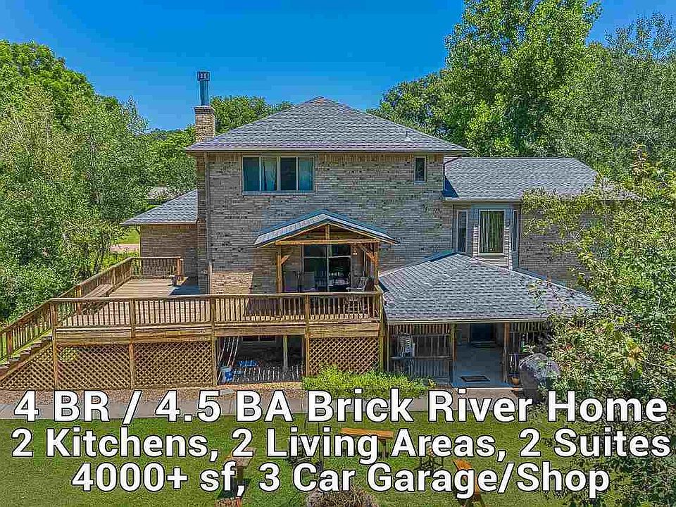 IMMACULATE, 4000+ sf ALL BRICK RIVER HOME, 4 BEDROOM, 4.5 BATH, 3 CAR GARAGE + SHOP, FULL BASEMENT, 2 OPEN LIVING AREAS, 2 KITCHENS, 2 FAMILY/TV/GAME AREAS, MANY OTHER GORGEOUS ROOMS, MANY POSSIBILITIES. Live in peaceful, private luxury and just minutes away, launch your river boat in the cool waters of the legendary White River. Right at the confluence of North Fork and the White, the stocked trout coming down the North Fork tail waters are just waiting for you -- yum yum. Perfect for family, guests, gatherings of all kinds. Live, retire, vacation, VRBO there is room for it all! The unique floor plan offers a spacious, open feel. The convenient galley kitchen has nook with bay window. Interesting, masterful use of open areas, vaulted ceilings and multiple levels connect family room, kitchen, dining area, and living area. From the cozy, intimate feeling of the wood burning fireplace, to the openness of the elevated dining room, there's something for everyone in this special home.