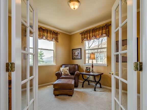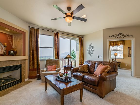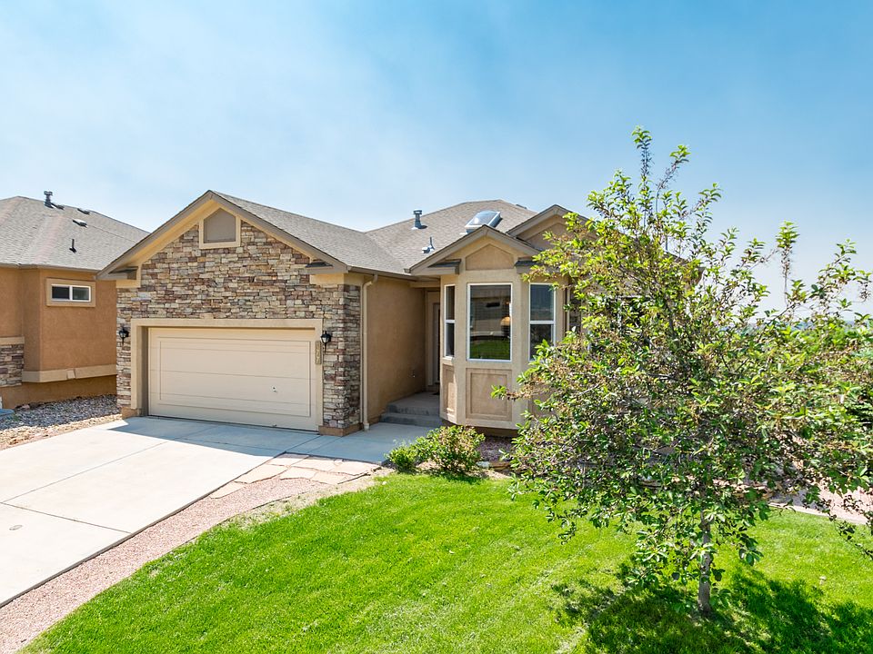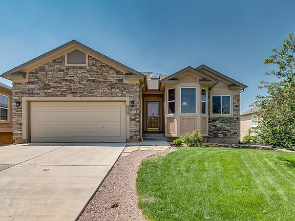 Stunning Jackson Creek ranch floorplan situated on a walk-out lot with sweeping views of Pikes Peak, USAFA & the Front Range. The welcoming foyer with gleaming hardwood floors draws you into the living room with gas fireplace and beautiful custom window coverings. French doors lead to the main level office. The spacious kitchen boasts maple cabinets, Corian counters, pantry, dining nook and all appliances included. The adjacent dining room overlooks the living room. Unwind in the master retreat offering a 5pc bath & walk-in closet. The finished walk-out lower level features a sprawling family room, two large bedrooms with walk-in closets and full bathroom with double vanity. Enjoy summer evenings on the composite deck overlooking the Front Range, Pikes Peak and the USAFA. The beautifully landscaped yard offers mature trees, privacy and patio areas. Excellent location, just minutes from I-25 with easy access to downtown Co Springs or Denver, USAFA, award winning District 38 Schools, shopping & dining.