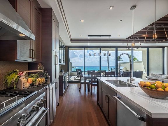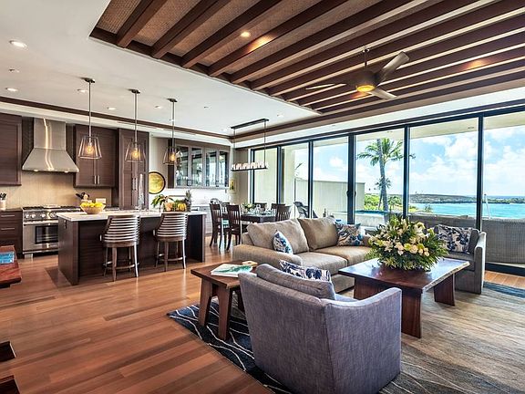Rarely on the market, the original villa townhomes at Timbers Kauai are stunning and timeless gems nestled above the 15th hole of the Hokuala Ocean Course. The 3 bedroom/3.5 bath villa has a split-level layout with over 3500 sf of total living space and takes front row seats to panoramic ocean views, beautiful Kaua’i sunrises and the annual winter parade of whales. The chef’s kitchen is a dream with granite and quartzite countertops, custom Sapele cabinetry, Thermador professional appliances a wine/beverage cooler and built-in icemaker. The wall-to-wall glass doors open up to a gracious lanai for seamless indoor/outdoor living. The lanai boasts over 1000sf of outdoor living space with a private pool, BBQ grill and one-of-a-kind views to the east with the Ninini Pt. Lighthouse as the iconic centerpiece of the ocean views. Upstairs, the Master Suite features a built-in beverage/coffee nook, luxurious Master Bath with soaking tub and a spacious lanai commanding the spectacular views. Two additional bedrooms suites provide plenty of room for family and guests.