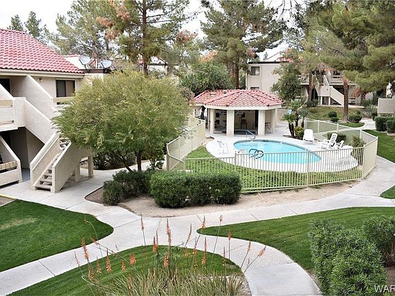 Upper level 2 bed/1 bath in beautiful Laughlin Bay Village! Perfect for that vacation/weekend get away! Great location...just steps away from 1 of 4 pools. Kitchen opens to living room w/access to the patio, Jack-n-Jill bathroom, all appliances, W/D, & a 1 car detached garage. There is plenty of additional open parking to include RV/boat parking availability. Laughlin Bay Village is a gated community w/4 swimming pools, 5 spas, gas bbq's, & meticulously landscaped w/lush green lawns & tall pines. Just minutes to Colorado River & Laughlin Casinos. 24 hour public transportation available. Buyer to verify sq ft, utilities, taxes, assessments & flood plain.