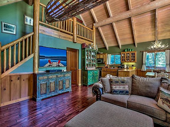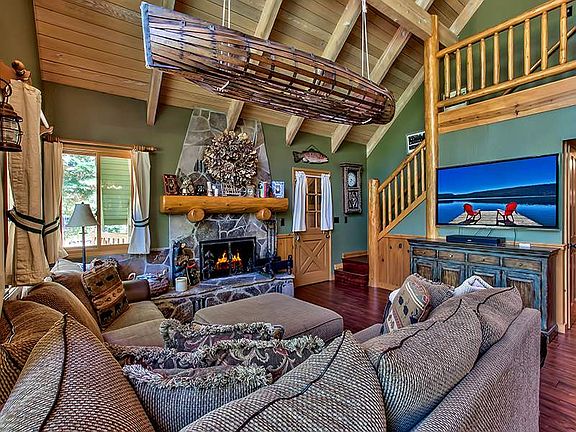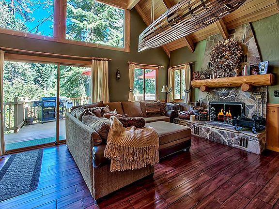 Very desirable Tahoe Pines location on the Lakeside of the main road, bordered by Tahoe Conservancy on Blackwood Creek at one end and just a short 2 block walk to the sandy beach and private Tahoe Pines pier.Nicely updated 3 bedroom, 2 bathroom Tahoe mountain home warmed by the rock fireplace and vauilted washed pine ceilings in the open main living and dining area. New hardwood floors throughout main floor giving way to a large beautiful trex deck for entertaining and barbecuing; then soak up the sore muscles in the hot tub while gazing up at Eagle Rock.