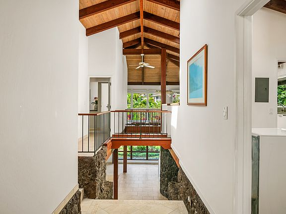 Tucked away in a quiet cul-de-sac in the resort community of Princeville, this beautifully designed home encompasses ideal north shore living with an oversized lot and private back yard. This home features traditional lava rock accents, vaulted wood-beamed ceilings, and large windows that invite natural light and share a connection with Kauai’s natural beauty.