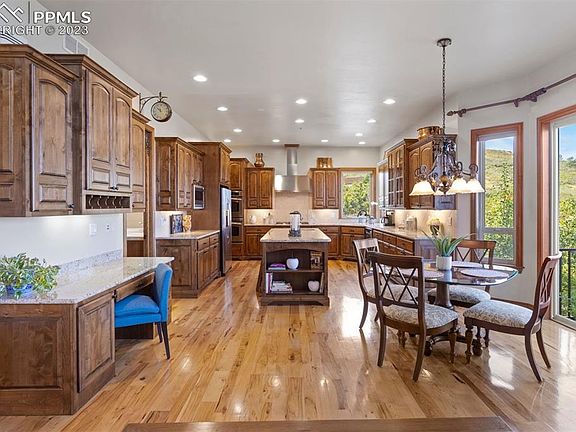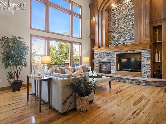 With dominating Front Range views, this beautiful residence is showcased by exquisite design, exceptional quality, and dedication to detail. Adjacent to Bell Mountain Ranch, this home is situated in a gated, upscale community on almost 4 acres, sheltered by gamble oak, green meadows, and rolling hills, and is surrounded by over 100 acres of open space to further enhance a sense of peace and privacy. Catering to a lifestyle of comfort and casual elegance, the home features gleaming Alder hardwood floors and cabinetry, curving 3-story staircase, home office, main level guest suite, and a walk-out basement. Inside, the striking staircase with wrought iron accents delicately winds its way between the levels. The great room is set beneath a soaring 20-foot ceiling and is embellished with large picture windows and a dramatic floor-to-ceiling stone fireplace, accented with wood. French doors open to a spacious home office, beautifully appointed with built-in shelving and stunning views. Expect nothing but the best from the kitchen! This deluxe culinary space is equipped with stainless appliances including double ovens, lustrous Alder cabinetry, granite counters, a walk-in pantry, and a built-in desk. Lovely corner windows with mountain views frame the kitchen and a large center island provides immense prep and storage space plus a breakfast bar. Informal meals can be shared around the cozy eat-in area or gather a party in the adjacent dining room. If outdoor entertaining is on the menu, a west-facing, full-length deck overlooks the mountains as well as a lower-level patio, wired for a hot tub. The owner’s suite has a double door entry, generous windows with tranquil views, gas fireplace, and deluxe 5-piece bath with a jetted soaking tub, large steam shower, granite vanity, and a walk-in closet. The home’s lower level is equally wonderful, with a sizable rec room with gas fireplace, game table area, a wet bar, and windows galore. 10-minute drive to downtown Castle Rock.