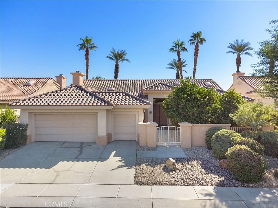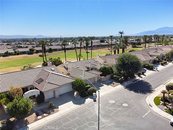 GOLF COURSE VIEW HOME! Welcome to the beautiful Sun City Palm Desert 55+ gated golf course community! Must see this beautiful "Emerald" floor plan! As you enter the home through the double door entry, you have a large formal living room and dining area with golf course and mountain views, then to a large spacious kitchen with a large island with an eat at bar, an abundance of countertop and cabinet space plus a breakfast nook area. The spacious family room is open to the kitchen and creates a "great room" concept. Off the formal living room area there is a spacious office/den with an attached half bathroom. The large primary suite has beautiful golf course and mountain views, large primary bathroom with dual sinks, step in shower, large soaking tub, and a large walk in closet. Laundry room has a folding table, sink and extra cabinets for storage. Spacious 2.5 car garage, perfect for 2 cars plus an area for golf cart/workshop/extra storage! Gated front yard with fruit trees. Southeast facing backyard is amazing with endless golf course and mountain views, a large alumawood covered patio, and low maintenance landscaping.