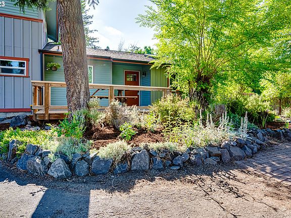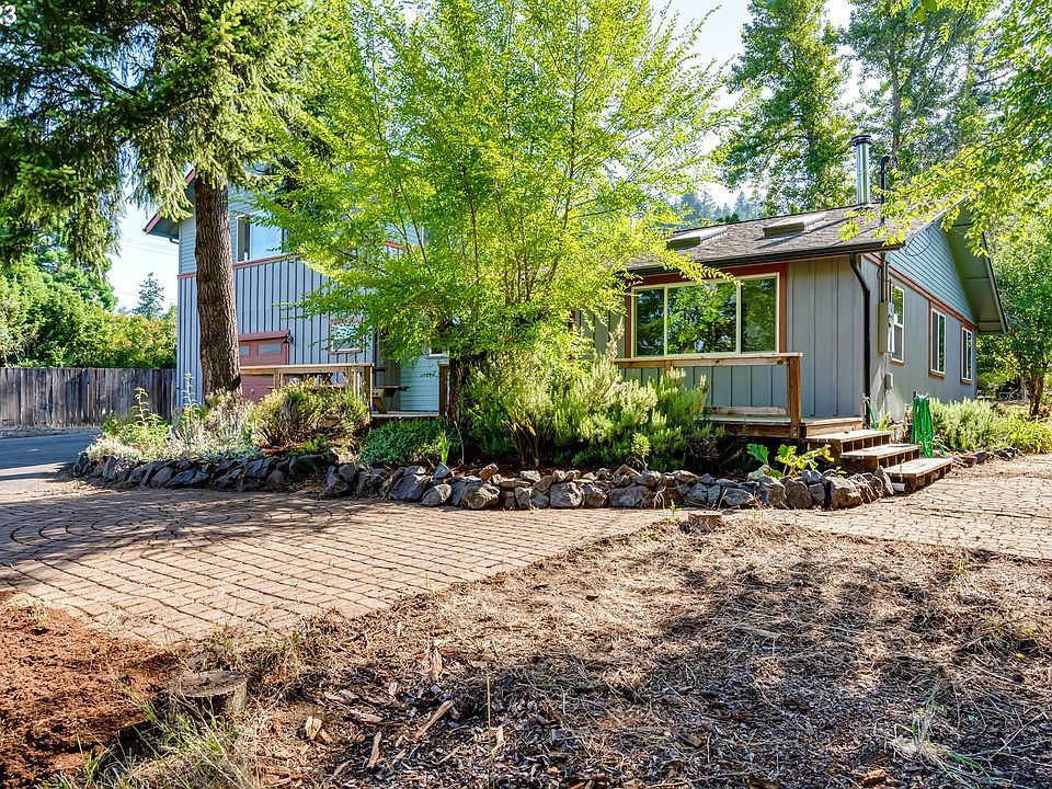 Freshly remodeled South Eugene home tucked back off the road on a large and private flaglot. Convenient location right on the bike path, walking trail, bus route and close to LCC, UofO, parks and schools. Spacious primary bedroom suite addition over the garage gives nice separation of space from rest of home - could be used as a bonus room or multi-generational living quarters? Gorgeous custom kitchen with concrete counters, hickory cabinets, pantry and eating bar. Large laundry/utility room and finished oversize garage provide tons of storage space. Newly refinished wood floors, a cozy woodstove, vaulted ceilings, skylights, custom hickory built-ins, updated bathrooms with cultured marble surrounds, new windows, double headed shower. Too much to list - come see!
