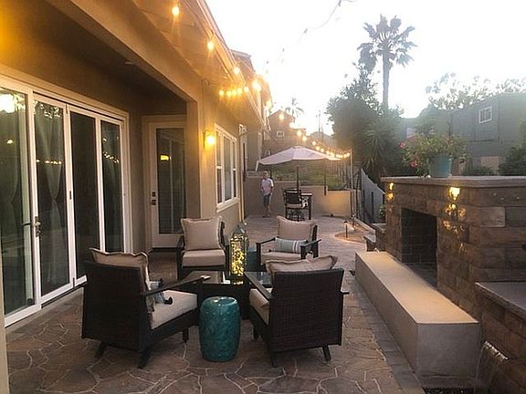 Upgraded landscaping with custom hardscape, large outdoor stone fireplace, water feature, planters, beautiful custom wood and stone bench. Landscaping lights and irrigation throughout.