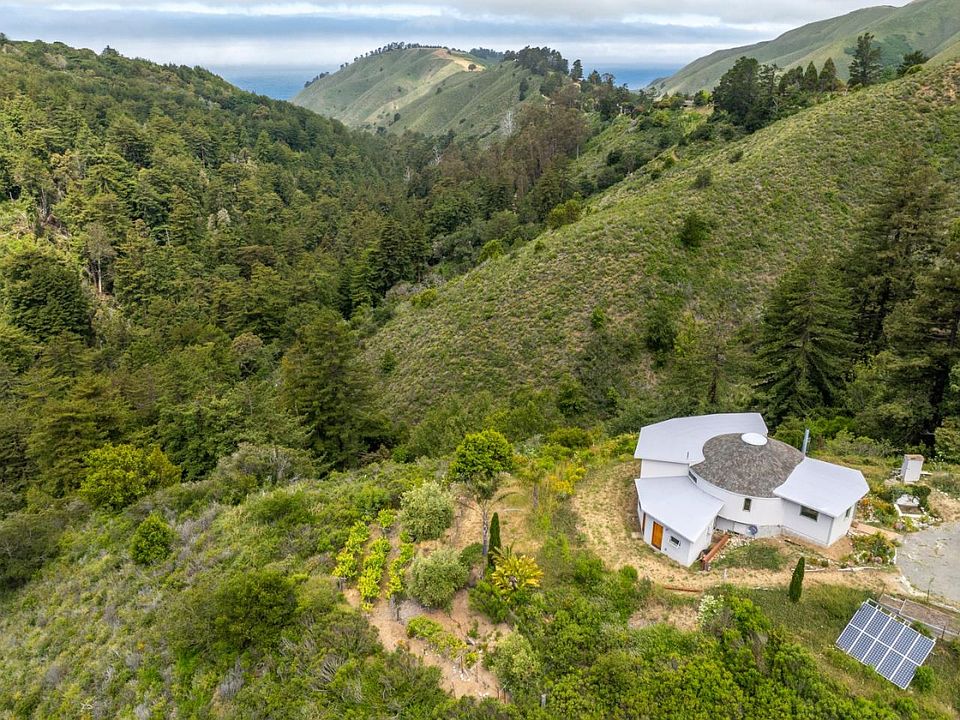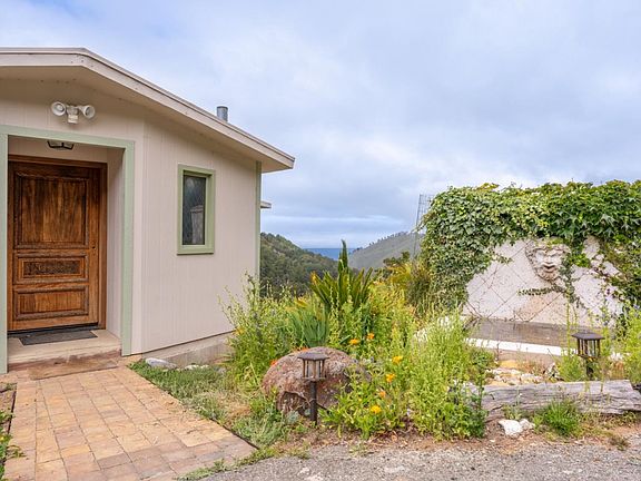 Sitting high atop a mountain overlooking Palo Colorado Canyon and the Pacific ocean beyond, this home is magical. Easily accessed by a paved road, the property features two separate sites within the 8+acre parcel, both with magnificent views: one with an artists studio and large storage shed on public power, and the other, a round house completely off-grid. Main level of house is open concept, with kitchen, living, sleeping area and bathroom on that level. Separate downstairs has laundry room, second bathroom and two bedrooms all framed in and ready for finish carpentry. All construction is fully permitted through Monterey County. Beloved by the current owners for 37 years, the home, which sits in a sunbelt, is lush with gardens, small vineyard and a beautiful fountain near the front door. Gorgeous, unobstructed views.