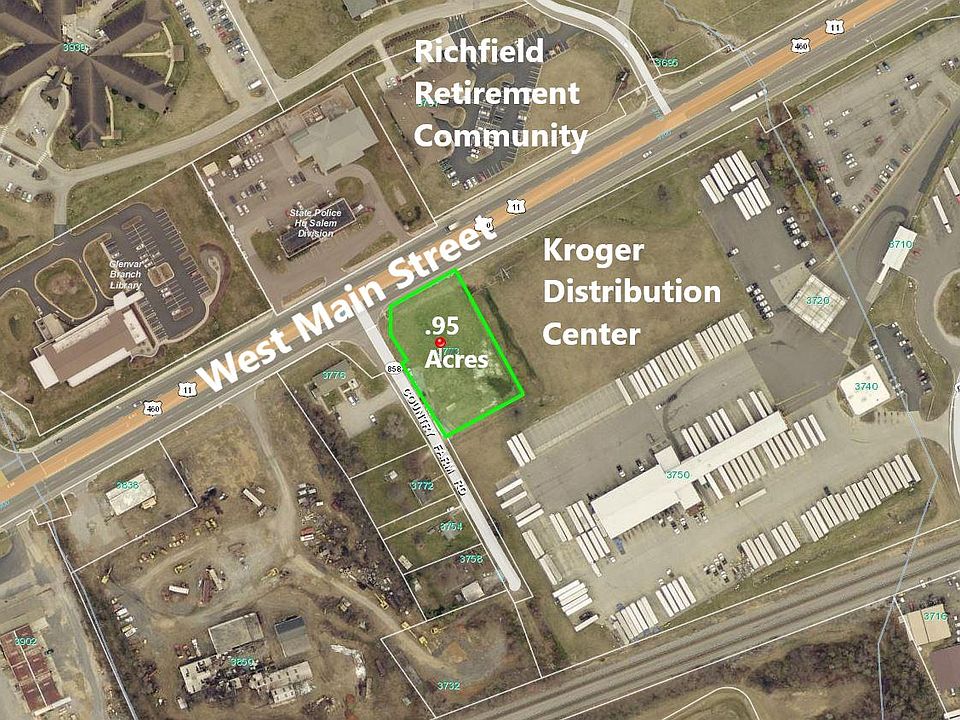 Nice level lot with frontage on West Main St. just inside West Roanoke County with Salem address. Directly across from Virginia State Police Headquarters and Richfield Retirement Community. Approximately 0.95 acres and Zoned I-2. Municipal water and septic system. Needs some fill on East side. Priced to sell.